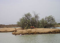 在腾格里深处有许多湖泊,远远望去,湖边堆堆盐囱恰似冰雪,湖面泛着银光,犹如沙海冰川。如面积有30公顷的沙漠高地湖泊高墩湖,湖里不但有鲤鱼,湖上还有野鸭